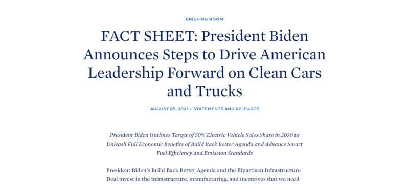8月5日电讯,美东时间周四凌晨,白宫官方发表声明,确认拜登政府即将发布有关促进清洁能源汽车产业的政策,同时也进一步卖力推销基建投资法案。