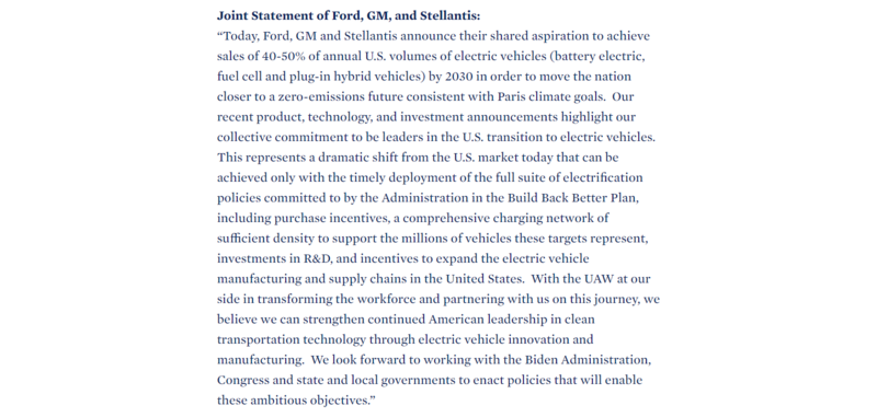 首当其冲的是底特律三巨头福特、通用和斯特兰蒂斯(合并前为FCA和PSA),三家公司在联合声明中表示共同抱有在2030年将清洁能源汽车销售比例提升至40%-50%的“愿景”。但巨头们也在声明中强调,与现状相比如此巨大的变化只有在白宫的BBB计划充分且及时到位的情况下才能实现。三家车企表示愿意与拜登政府、国会和地方政府合作制定政策,以实现这些雄心勃勃的目标。