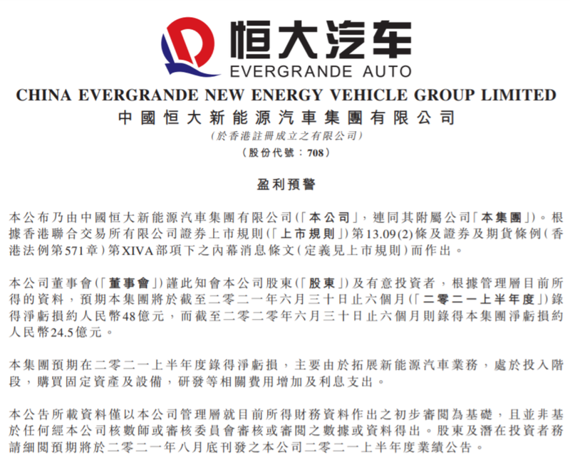 8月9日晚间,恒大汽车发布盈利预警公告。