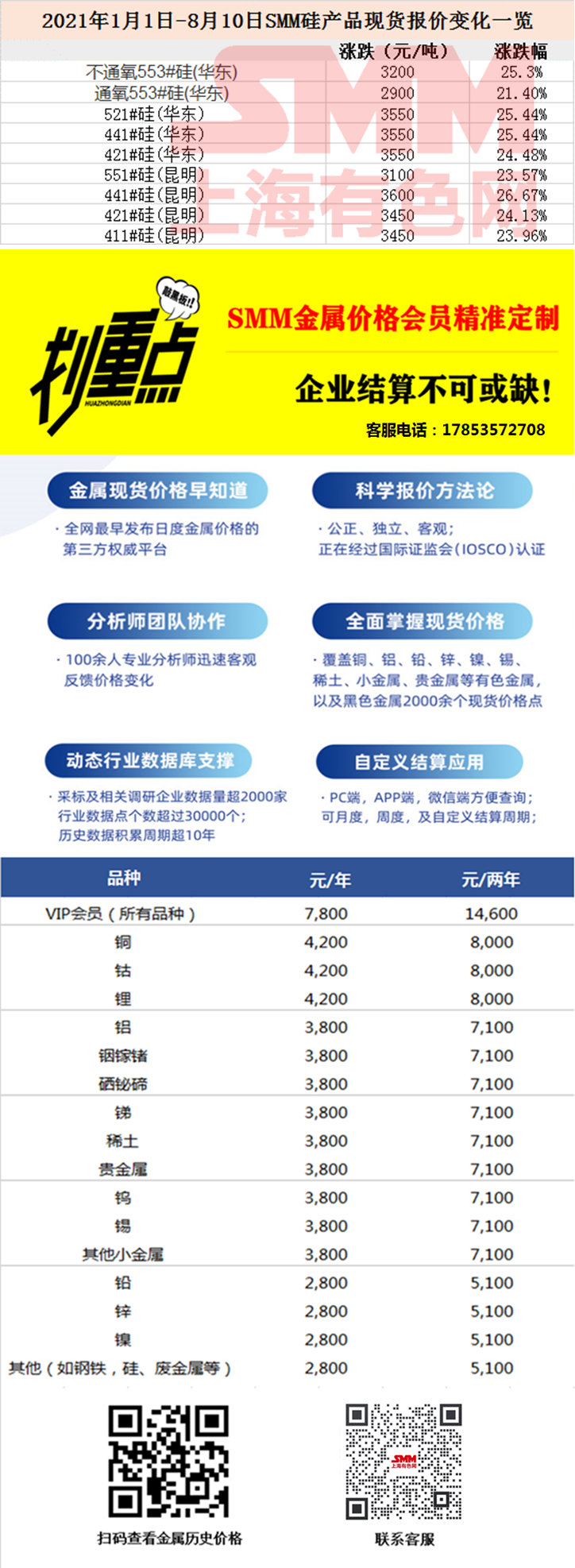今年以来,硅价呈持续上涨趋势,8月10日SMM521#硅(华东)现货均价报17500元/吨,年初至今,多个硅产品涨幅超过20%。 近期以来硅价持续走高,三大主产区之二的云南、四川出现不同程度限电,新疆大厂的持续减产、周边内蒙、广西等小产区限电减产,未来供应不确定性大,金属硅市场现货偏紧,叠加市场利多情绪刺激,促进硅价不断攀高。