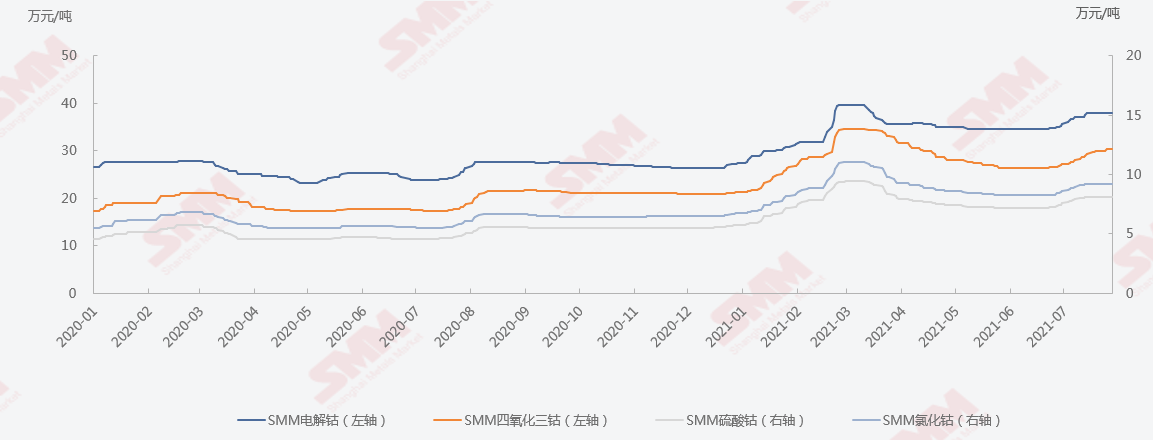 电解钴方面:2021年7月电解钴月均价为37.3万元/吨,环比上涨7%。据SMM分析称,月初价格上涨,主因海外航空、军工对合金需求提升,电解钴贸易商囤货意愿增强。月中下游合金厂近期订单增加,采购量增多导致价格上涨。月末价格持稳,海外市场夏休交投清淡,国内电解钴供应商出货意愿逐步增加。