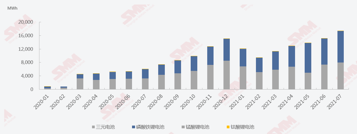 据统计,2021年7月国内动力电池产量达17.4GWh,同比大幅增长185.3%,环比增长14.2%。其中,三元电池产量8GWh,占总产量46%,同比增长144%,环比增长8.6%;磷酸铁锂电池产量9.3GWh,产量占比进一步上升至53.8%,同比增长236.2%,环比增长20%。