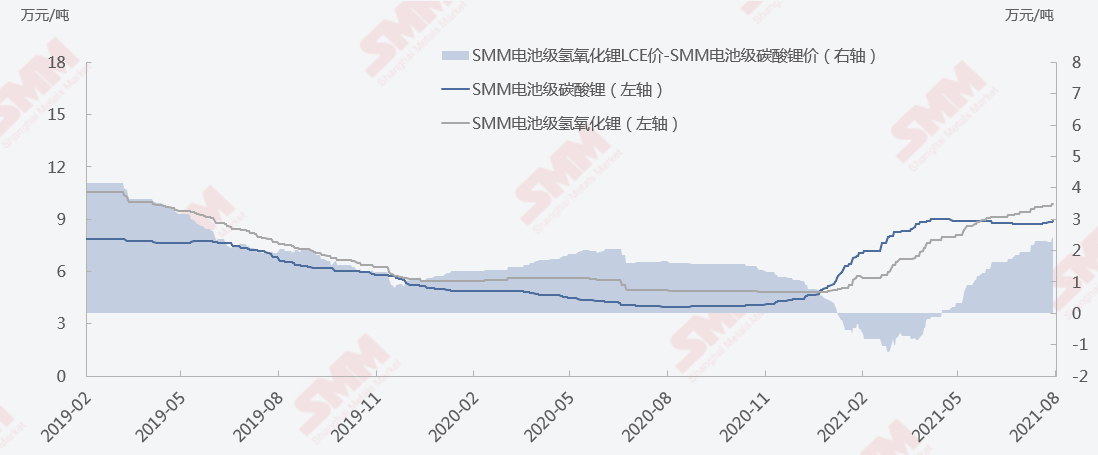 供应端,2021年7月中国氢氧化锂产量约12,727吨,环比减少11%,同比增长61%。7月电氢市场缺货明显,主流大厂停产检修至7月底,叠加海外出口量增加,导致国内现货市场紧缺明显。四川等省份高温导致用电新高,拉闸限电,供应量仍有小幅影响。