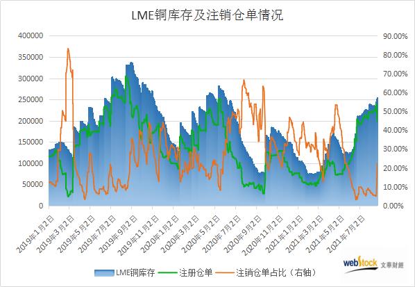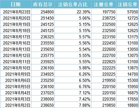 LME公布的数据显示,截至8月23日,LME铜注销仓单此前一直低位徘徊,今日突然暴增至57050吨,注销占比直线拉升至22.39%。注册仓单上周呈现增加姿态,今日突然明显回落至197750吨。