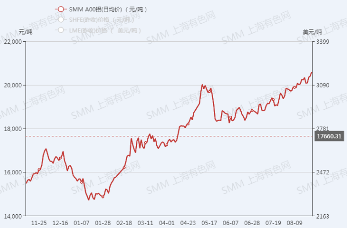 今年以来,铝价持续上涨,截止今日下午14时30分,沪铝主力合约报20575元/吨,盘中一度涨至20705元/吨,为今年来最高点,且较之年初15460元/吨,上涨5245元/吨,涨幅达33.93%。SMM A00铝报20600元/吨,较之15710元/吨,上涨4890元/吨,涨幅达31.13%。近期美元走势走势承压叠加美基建支撑外盘铝价,国内基本面,供应端仍多扰动,但国内消费需求同期回落,全国铝锭社会库存持续表现仅小幅累库。供需矛盾下,预计短期内铝价仍表现较强区间运行。