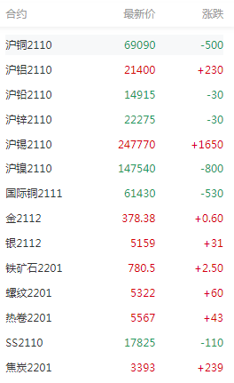 截止午间收盘,金属及原油市场合约情况: