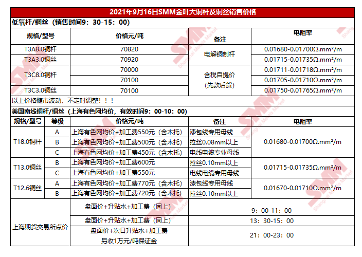 9月16日SMM金叶大铜铜杆及铜丝报价