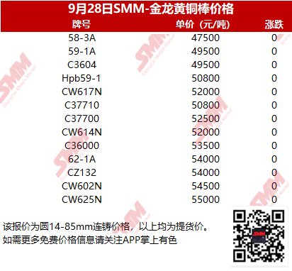 【SMM价格】2021年9月28日金龙黄铜棒价格