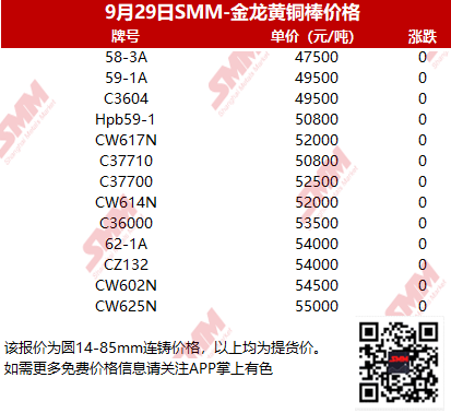 【SMM价格】2021年9月29日金龙黄铜棒价格