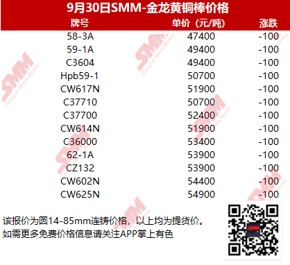 【SMM价格】2021年9月30日金龙黄铜棒价格