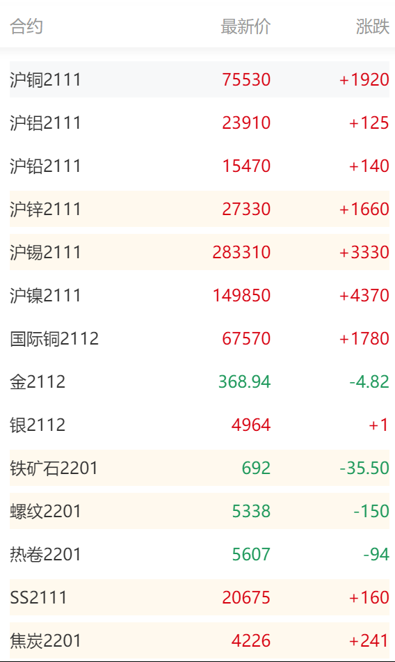 SMM 10月18日讯:美债收益率上周五大幅攀升,因美国9月零售销售意外增加,且一项市场通胀预期指标触及2005年以来最高,这加剧了美债市场有关利率路径的看空情绪。值得一提的是,眼下利率掉期显示美联储明年6月加息的几率都已经达到了接近50%,这或许预示着美联储前脚刚结束QE,后脚就有可能启动加息进程!今日有色金属市场内外分化,截至9:40分左右,内盘方面,沪锌早盘再次走高,涨幅超6%,盘中触及27720元,创下十四年新高,沪铜受低库存的推动下价格走高,早盘同样表现大好,涨近3%,重回75000元上方,沪镍同样涨近3%,其余品种也都表现亮眼。外盘则整体表现弱势,除伦锡录得小幅上涨外,其余品种纷纷走跌。黑色系方面,焦煤焦炭仍保持上涨势头,其中焦炭涨近6%,铁矿走低,跌超5%。