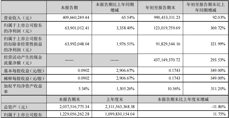 东方锆业公告,第三季度实现净利润6390万元,同比增长3358.4%;前三季度实现净利润1.23亿元,同比增长369.72%。