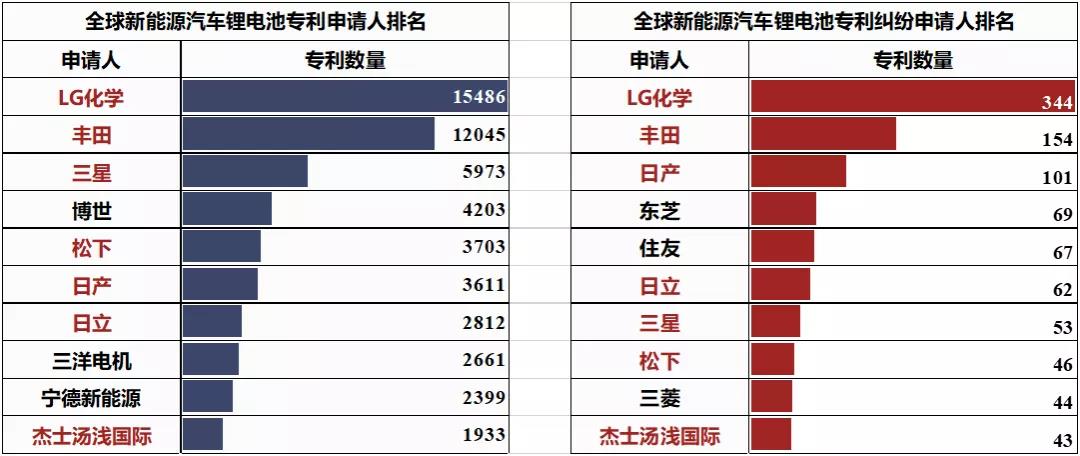 图8 全球新能源汽车锂电池申请人申请量及专利纠纷量排名对比