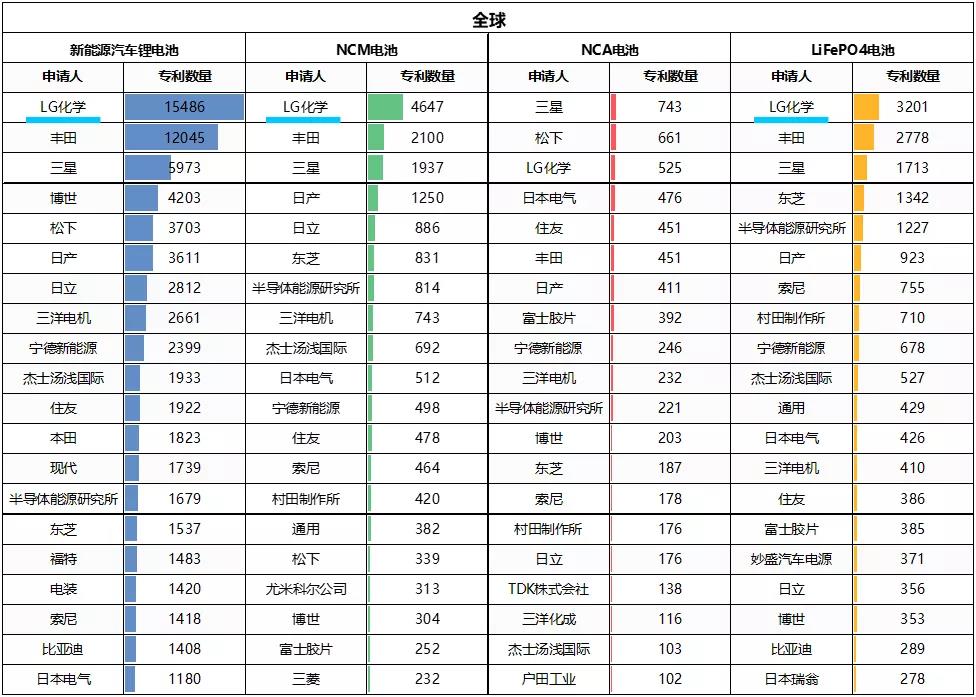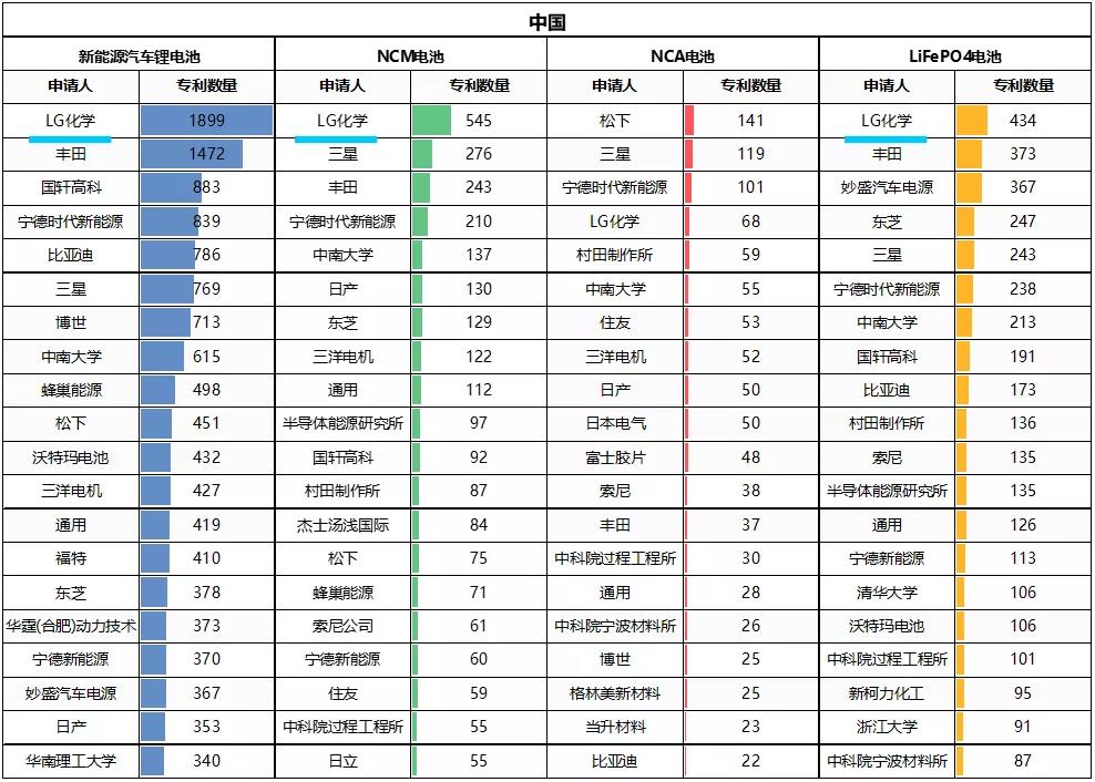 从申请人排名来看,在全球新能源汽车锂电池排名前十分别为:LG化学、丰田、三星、博世、松下、日产、日立、三洋电机、宁德新能源、杰士汤浅国际(图5)。在中国新能源汽车锂电池排名前十分别为:LG化学、丰田、国轩高科、宁德时代新能源、比亚迪、三星、博世、中南大学、蜂巢能源、松下(图6),可见除NCA电池外,LG化学在所有排名中均位列第一。