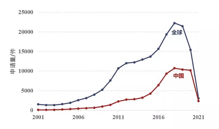 图3 全球和中国新能源汽车锂电池专利申请趋势