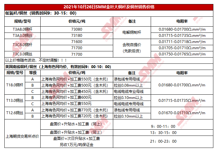 10月26日SMM金叶大铜铜杆及铜丝报价