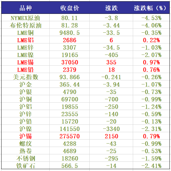 国际原油方面,美国能源信息署周三公布的报告显示,美国原油库存连续第二周增加,消息令原油市场承压,美油、布油期货均收跌3%以上。原油市场回落令金属市场利好有所减弱。