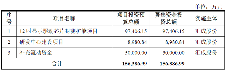 此次IPO,汇成股份拟发行不超过2.23亿股,并授予主承销商不超过前述发行股数15%的超额配售选择权。公司拟募资15.64亿元,其中9.74亿元(占62%)用于12吋显示驱动芯片封测扩能项目。