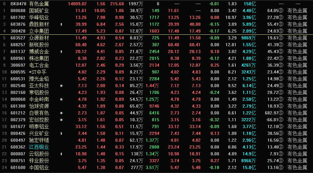 股市方面,有色金属板块今日上涨,板块指数涨1.56%,个股方面,国成矿业涨停,华峰铝业涨近8%,鼎盛新材、立中集团等纷纷跟涨。