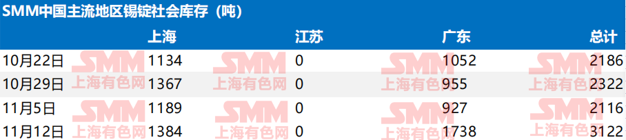 据SMM了解,截至本周五(11月5日),据贸易商反馈本周现货市场整体货源依旧偏紧,但市场情绪稍显平稳。冶炼厂间报价分歧降低,上游整体报价偏向挺价策略。现货市场整体成交一般,随着锡价上涨市场成交明显转差,询价者寥寥无几。