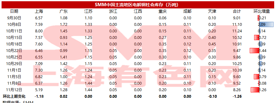 截至11月12日周五,SMM全国主流铜地区市场库存环比周一减少1.26万吨至8.26万吨,年内首次降至9万吨以下,再度创出新低。周内全国去库主要发生在上海和天津地区,其中上海地区库存减少1.18万吨至5.19万吨,本周进口铜清关量减少且国内电解铜到货亦减少(部分国内电解铜出口至国外),是导致上海库存减少的主要原因;天津地区库存减少0.1万吨至0万吨,受东北寒潮影响导致东北的电解铜无法南下,下游以消耗仓库和自身库存为主。广东地区库存增加0.02万吨至1.28万吨,主要是受进口铜到货增加和北方(福建和江西)到货增加刺激;其余地区变化不大。
