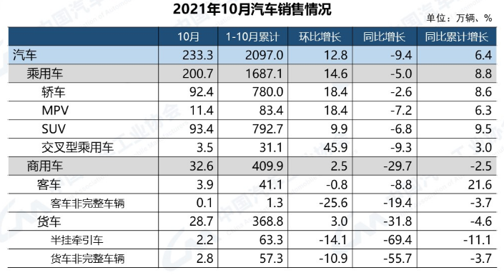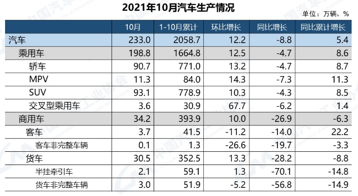 10月汽车行业努力克服电力供应紧张、原材料价格高位运行等诸多不利因素影响,以及车规级芯片供应形势稍好于三季度,汽车产销继续呈现恢复态势,总体形势有好转迹象。