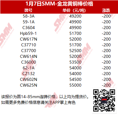 【SMM价格】2022年1月7日金龙黄铜棒价格