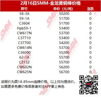 【SMM价格】2022年2月16日金龙黄铜棒价格