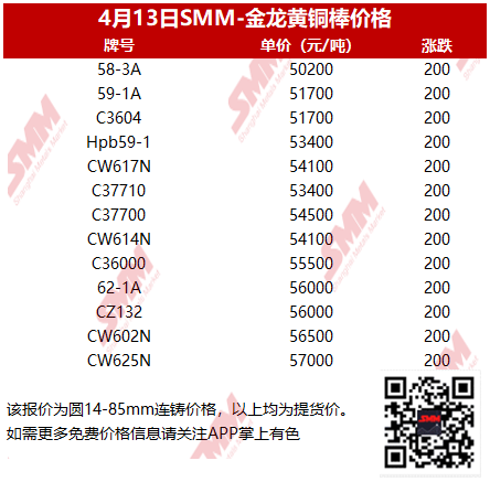 【SMM价格】2022年4月13日金龙黄铜棒价格