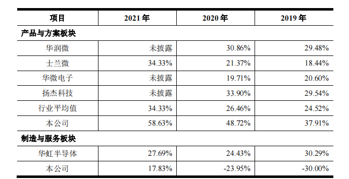 从同行可比公司数据对比来看,报告期各期,燕东微的产品与方案板块毛利率均高于同行可比公司。一方面得益于特种集成电路业务的高毛利率;另一方面,2019年和2020年,制造与服务板块毛利率为负,随着晶圆制造产能逐渐达产,2021年制造与服务板块毛利率已转正。