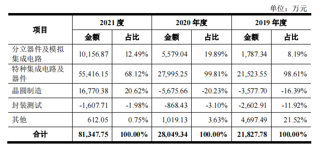 不过,晶圆制造业务方面,2019年至2020年毛利为负,主要原因系晶圆生产线产能未完全达产、固定成本较高所致。2021年,由于8英寸晶圆生产线达产,晶圆代工产能显著提升,成本降幅明显,晶圆制造业务毛利由负转正。