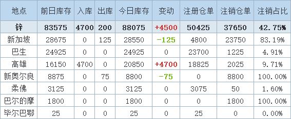6月6日,LME锌库存增加4500吨,其中高雄仓库贡献主要增幅,累库4700吨,新加坡仓库去库125吨,新奥尔良仓库去库75吨。