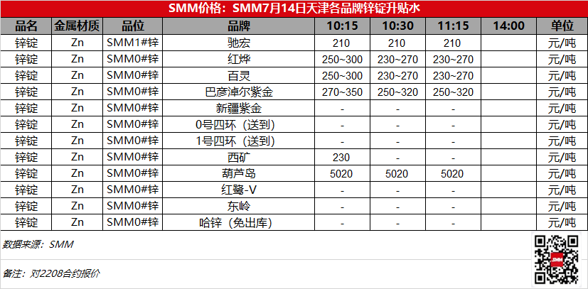 SMM7月14日讯:天津市场0#锌锭主流成交于22290~22650元/吨,紫金成交于22310~22700元/吨,葫芦岛报在27400元/吨,0#锌普通对2208合约报升水230-270元/吨附近,紫金对2208月合约升250-320元/吨附近,津市较沪市贴水30元/吨。今日锌价大幅下挫,现货市场维持升贴水报价,报价较为分散。截止午市收盘,普通品牌百灵对08合约升水230-270元/吨左右,红烨对08合约升水230-270元/吨左右,驰宏暂无报价,高价品牌紫金对08合约升水250-320元/吨,哈锌(免出库)缺货。今日锌价大幅走弱,贸易商积极出货为主,消费不佳下升水上行乏力;下游企业因锌价补跌,昨晚点价较多,今日延续逢低采买。整体来看天津市场成交较好。1#锌锭成交于22050~22380元/吨附近。