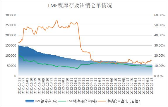 一直以来LME镍库存呈现缓慢去化局面,注册仓单基本同步变化,注销占比前期一直呈现区间波动状态,最近有所攀升。