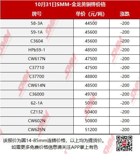 【SMM价格】2022年10月31日金龙黄铜棒价格