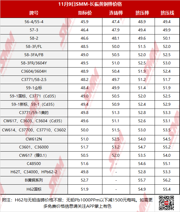 【SMM价格】2022年11月9日金龙黄铜棒价格