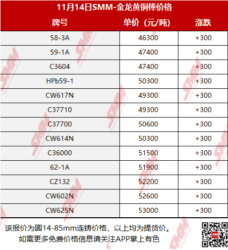 【SMM价格】2022年11月14日金龙黄铜棒价格