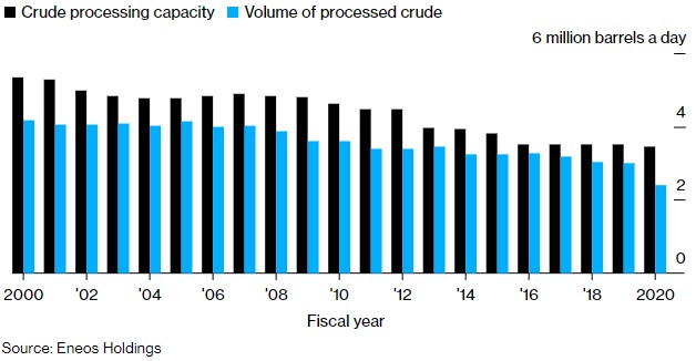 由于人口减少和碳减排计划导致需求下滑,日本最大的炼油厂正在制定计划以整合石油产量。Eneos Holdings Inc.总裁斋藤武史(Takeshi Saito)在接受采访时表示,Eneos已经制定了公司业务整合大纲,但具体关闭哪些炼油厂仍在商议中。Eneos预计到2040年于日本国内燃料的需求将下降50%,该公司已宣布计划明年关闭其10家炼油厂中的一家。
