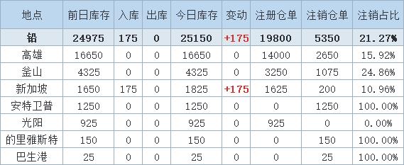 2月21日LME铅库存增加175吨,全部注入新加坡仓库,其余所有地区库存数据暂无波动。截止2月21日,LME铅库存总计25150吨。