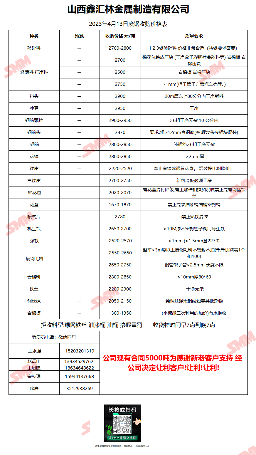 今日山西鑫汇林 废钢收购报价已更新,有货的朋友欢迎联系我们!