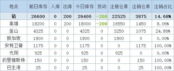 4月14日LME铅库存去库200吨,全部来自高雄仓库,其余地区库存数据暂无波动。截止4月14日,LME铅仓库总计26400吨。