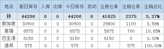 4月14日LME锌库存较前一日持平,所有地区库存数据暂无波动,LME锌最新库存数据为44200吨。