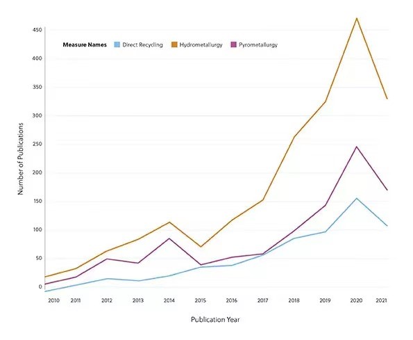如今的三种电池回收方法,其中湿法和火法冶金的联合是主要的回收方式。由于成本和复杂程度较低,湿法冶金和火法而今的研究文献和专利数量呈指数级增长(见下图)。湿法冶金使用溶液(主要是水溶液)从电池资源中提取分离金属,而火法冶金利用热量将电池材料中使用的金属氧化物转化为金属或者金属氧化物。直接回收则是对电池去除负极材料后进行再利用和修复。