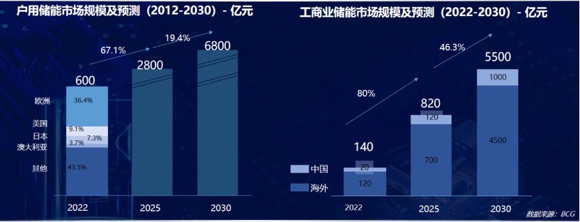 根据波士顿咨询公司的测算,2030年全球户储市场规模达到6800亿元;主要市场在欧美日澳等国,尤其是非洲等弱电网地区对户储的需求增长迅速。工商业储能主要满足工商业场景的储能需求,预计2030年市场规模达到5500亿元,并进入存量替换阶段。
