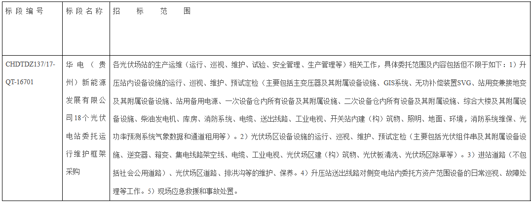 备注:1. 本次为框架招标,中标人取得华电(贵州》新能源发展有限公司18个光伏电站委托运行维护项目框架采购入围供应商资格。