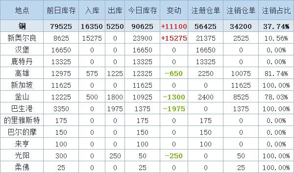 外电6月16日消息,以下为6月16日LME铜库存在全球主要仓库的分布变动情况:6月16日LME铜库存增加11100吨,其中,新奥尔良铜库存增加15275吨,高雄铜库存减少650吨,釜山铜库存减少1300吨,巴生港铜库存减少1975吨,光阳铜库存减少250吨。6月16日累计增加铜库存11100吨。6月16日LME铜仓库最新库存数据为90625吨。