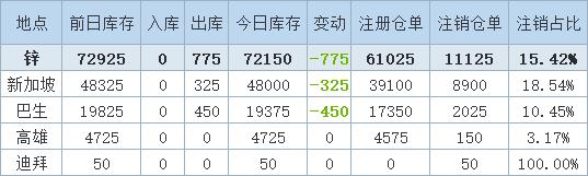 7月12日LME锌库存减少775吨,降幅源自新加坡和巴生两地仓库,新加坡仓库去库325吨,巴生仓库去库450吨,总计去库775吨。截止7月12日,LME锌仓库总计72150吨。
