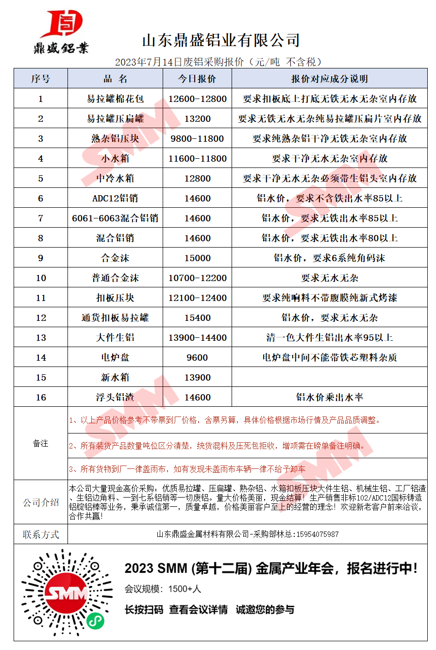 7月14日山东鼎盛 废铝采购报价