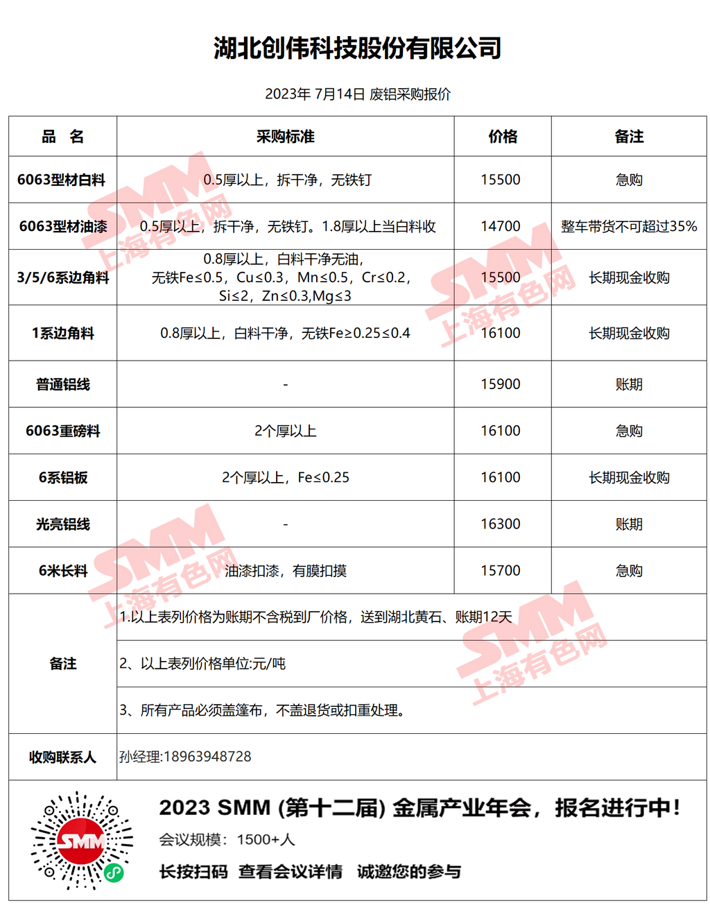 今日创伟科技 废铝采购报价已更新,有货的朋友欢迎联系我们!