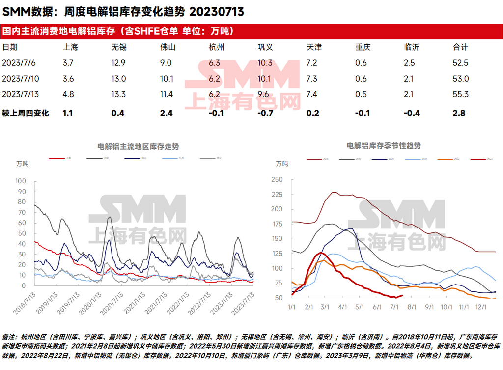 从华南的仓库数据上来看,七月以来华南铝锭到货量增加明显,在供应增长预期下现货或将承压,市场看跌情绪浓厚,买方接货意愿减弱,出货表现遇冷。目前市场不确定性仍较高,近期华南铝锭库存累库较快,进入七月需求侧依旧表现偏淡,但因对次月升水已恢复相对合理水平,后期华南现货升贴水或可逐渐企稳。